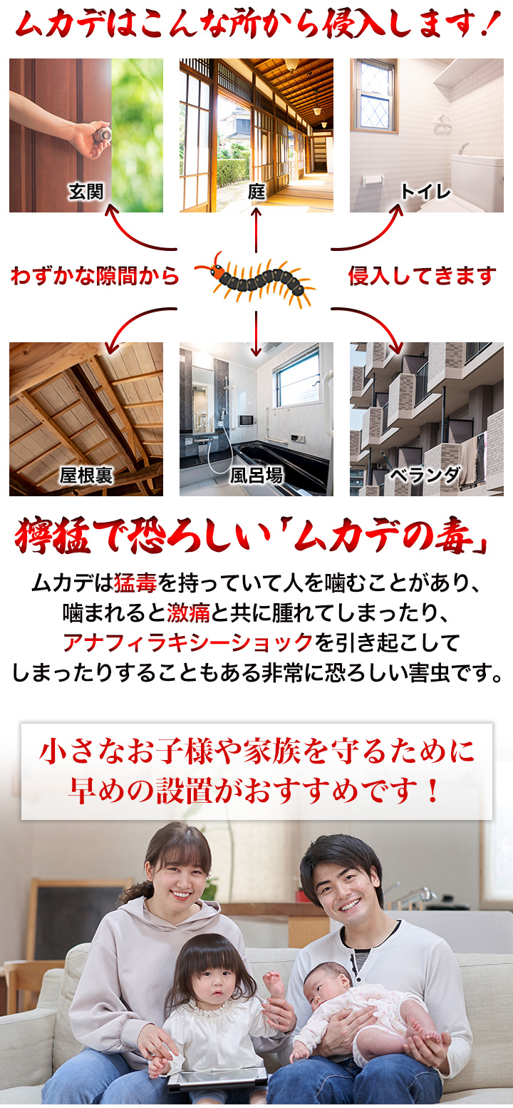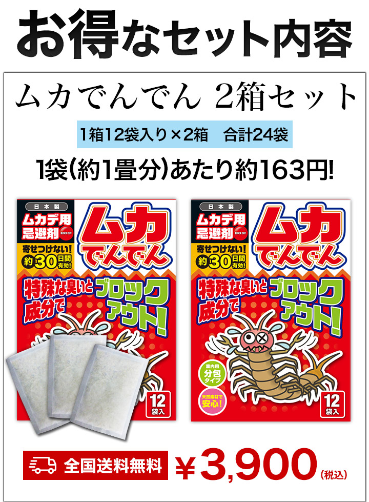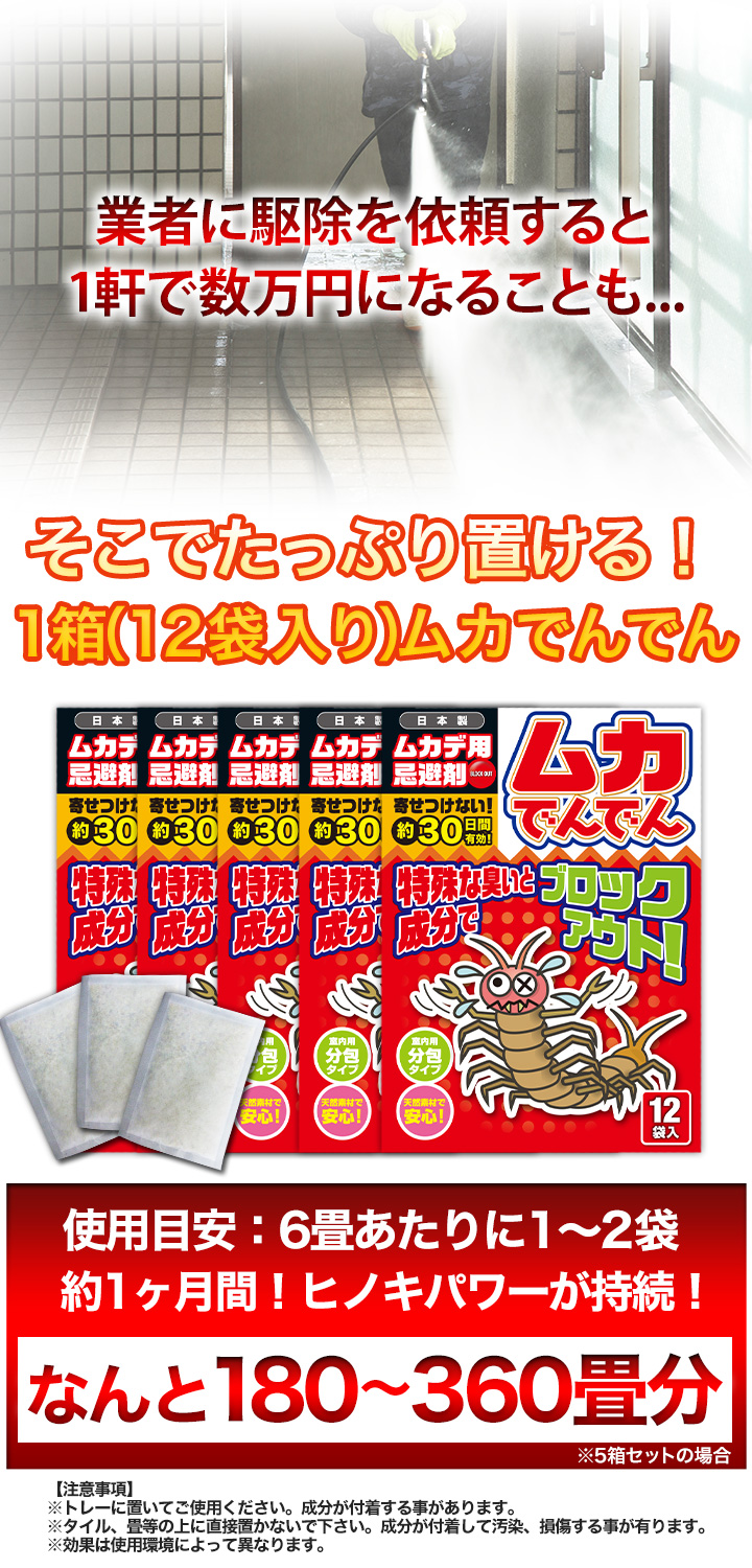 - ムカデの通り道や被害場所に置いてください。(6畳に1~2袋)
