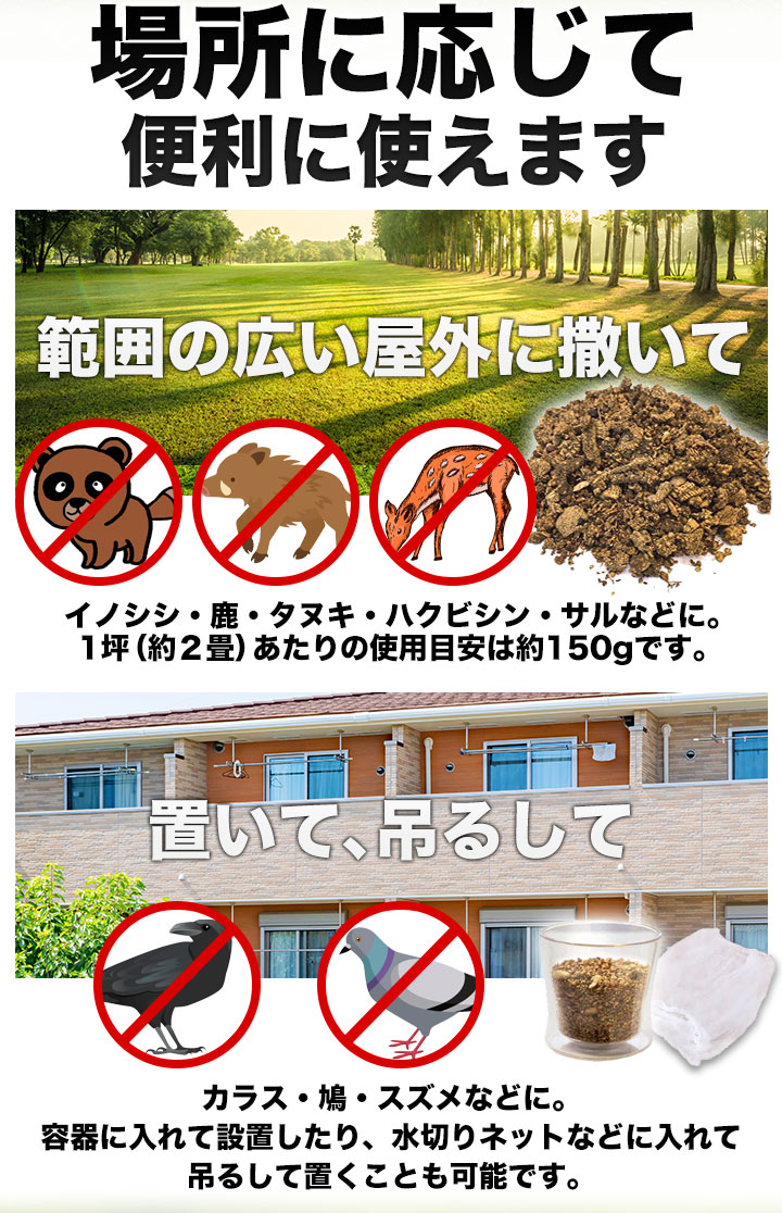- 【害獣】シカ、イノシシ、サル、ハクビシン、アライグマ、イタチ、キツネ、タヌキ、カラス、ハト、ムクドリなど