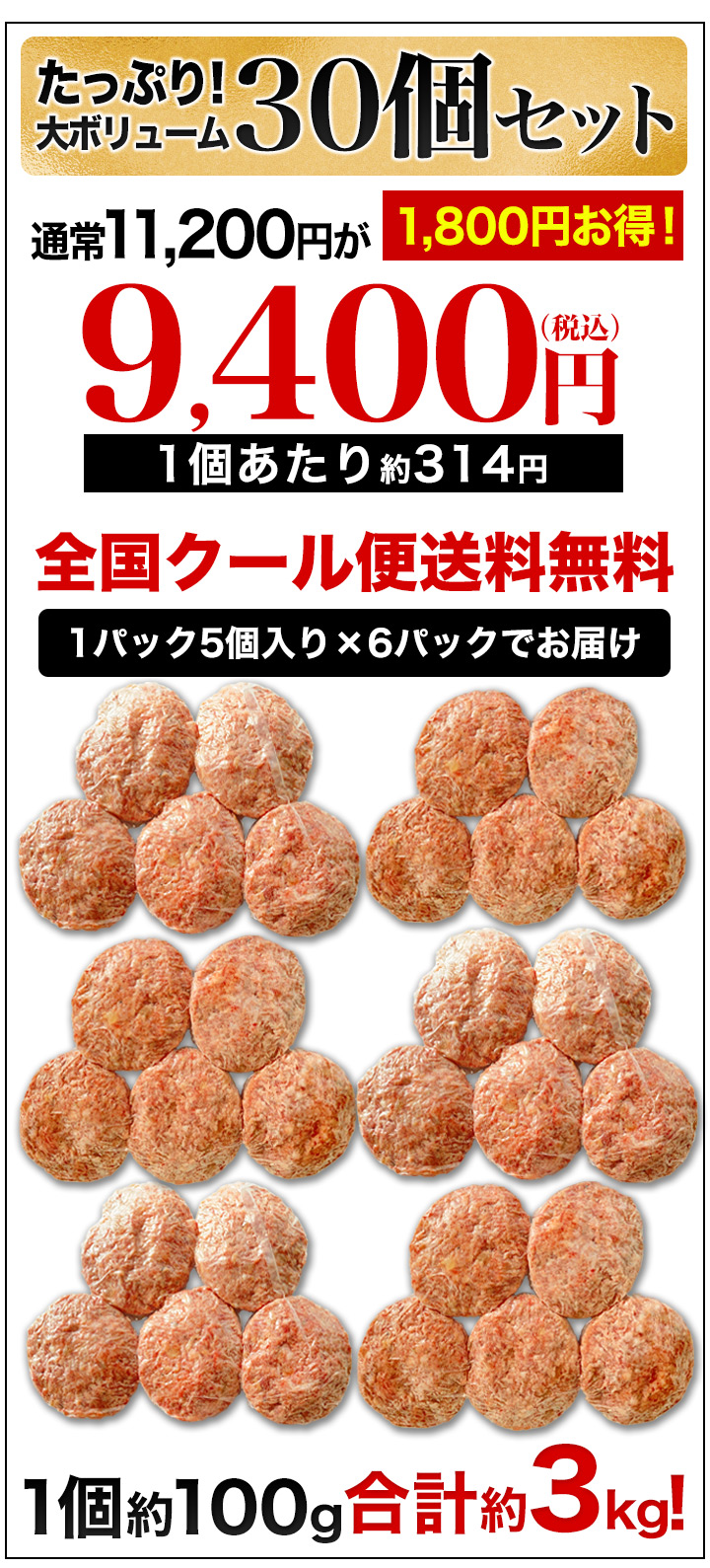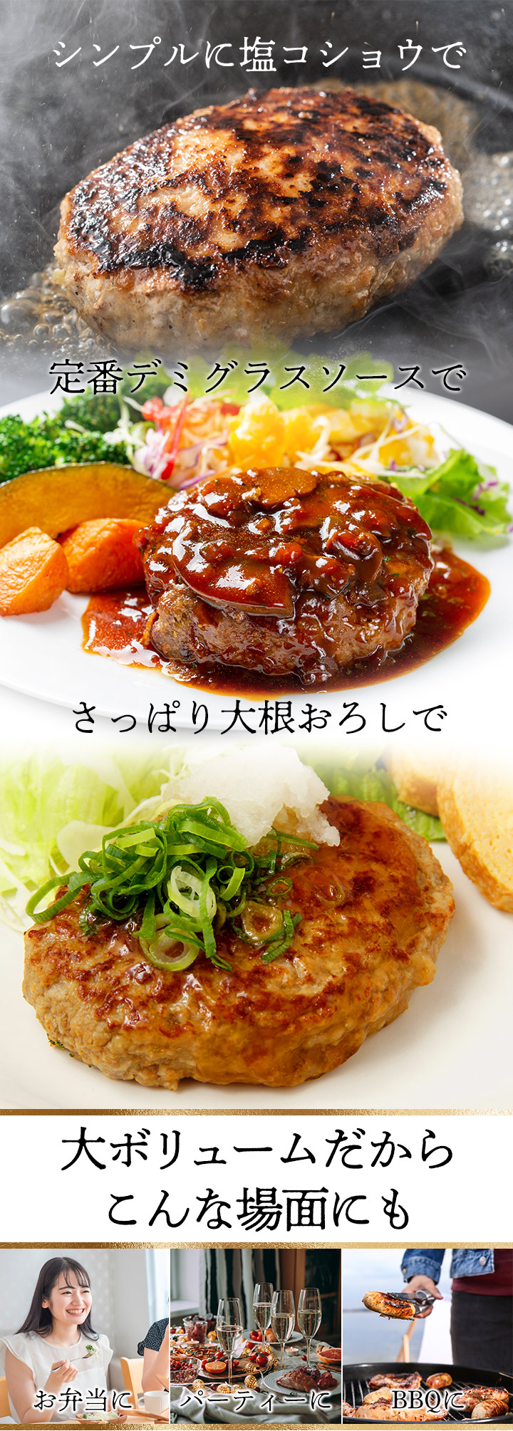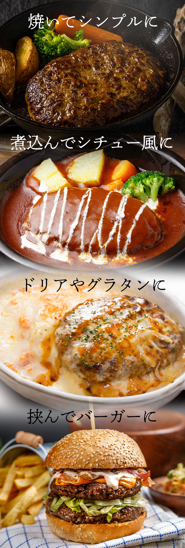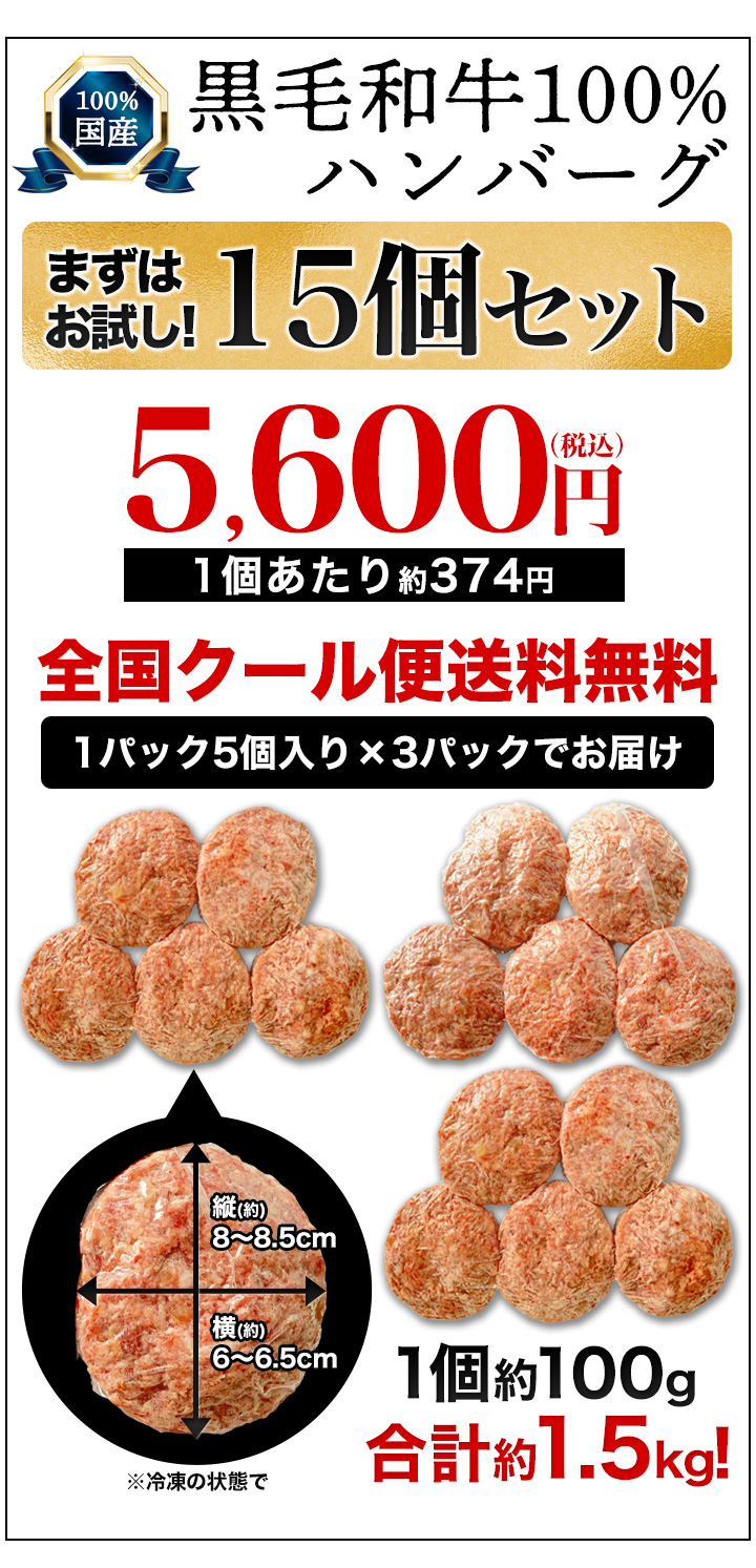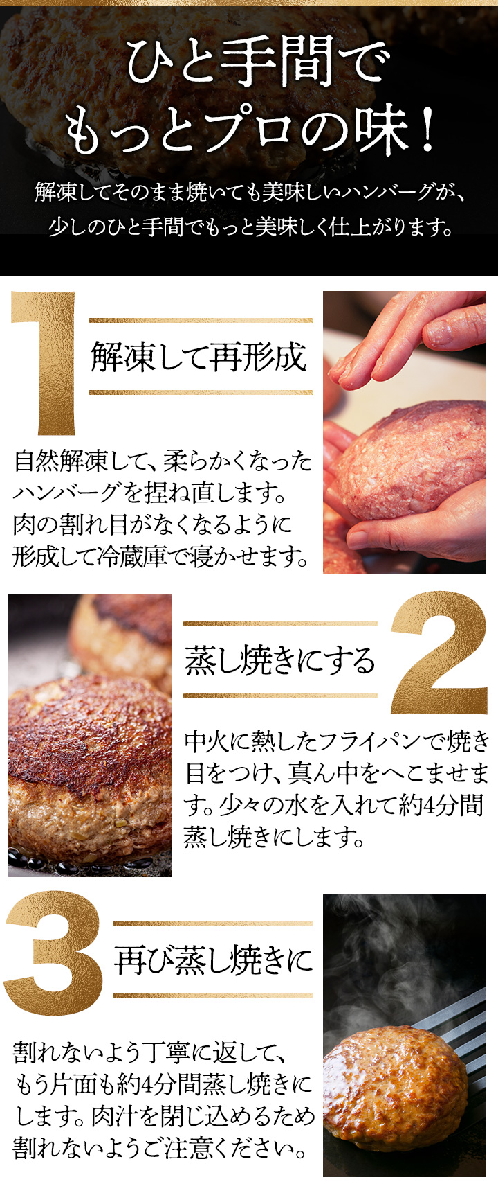 黒毛和牛を100%使った生ハンバーグを大ボリュームでお届け!