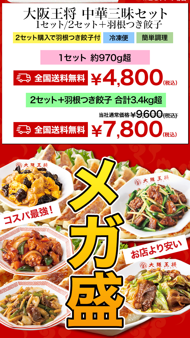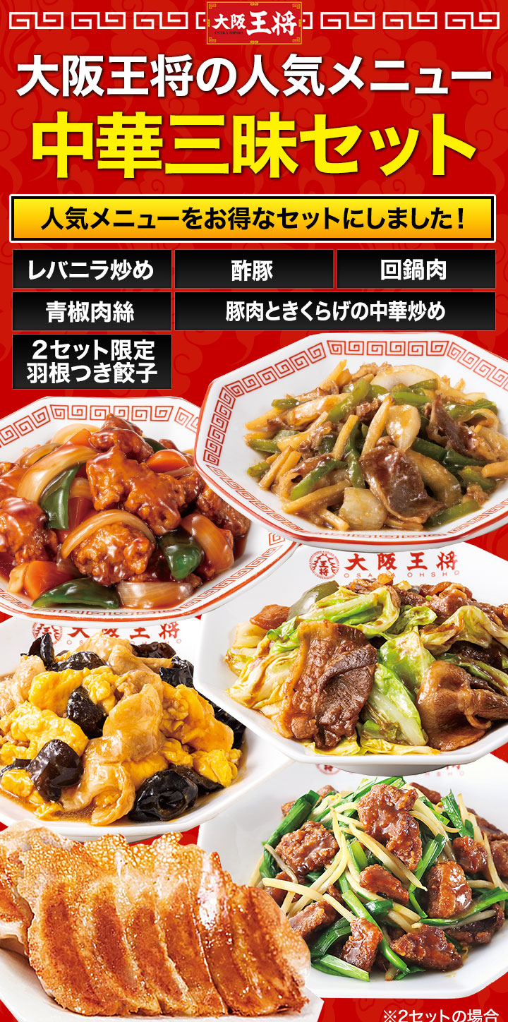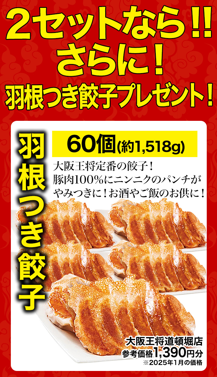 大阪王将の人気メニュー!2セットご購入なら羽根つき餃子プレゼント!
