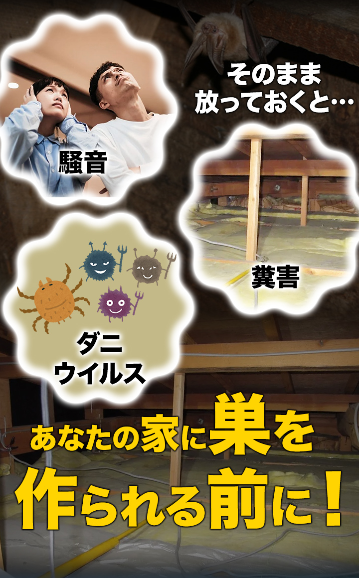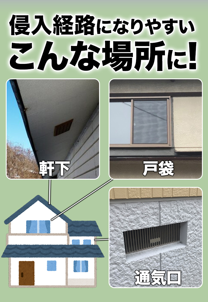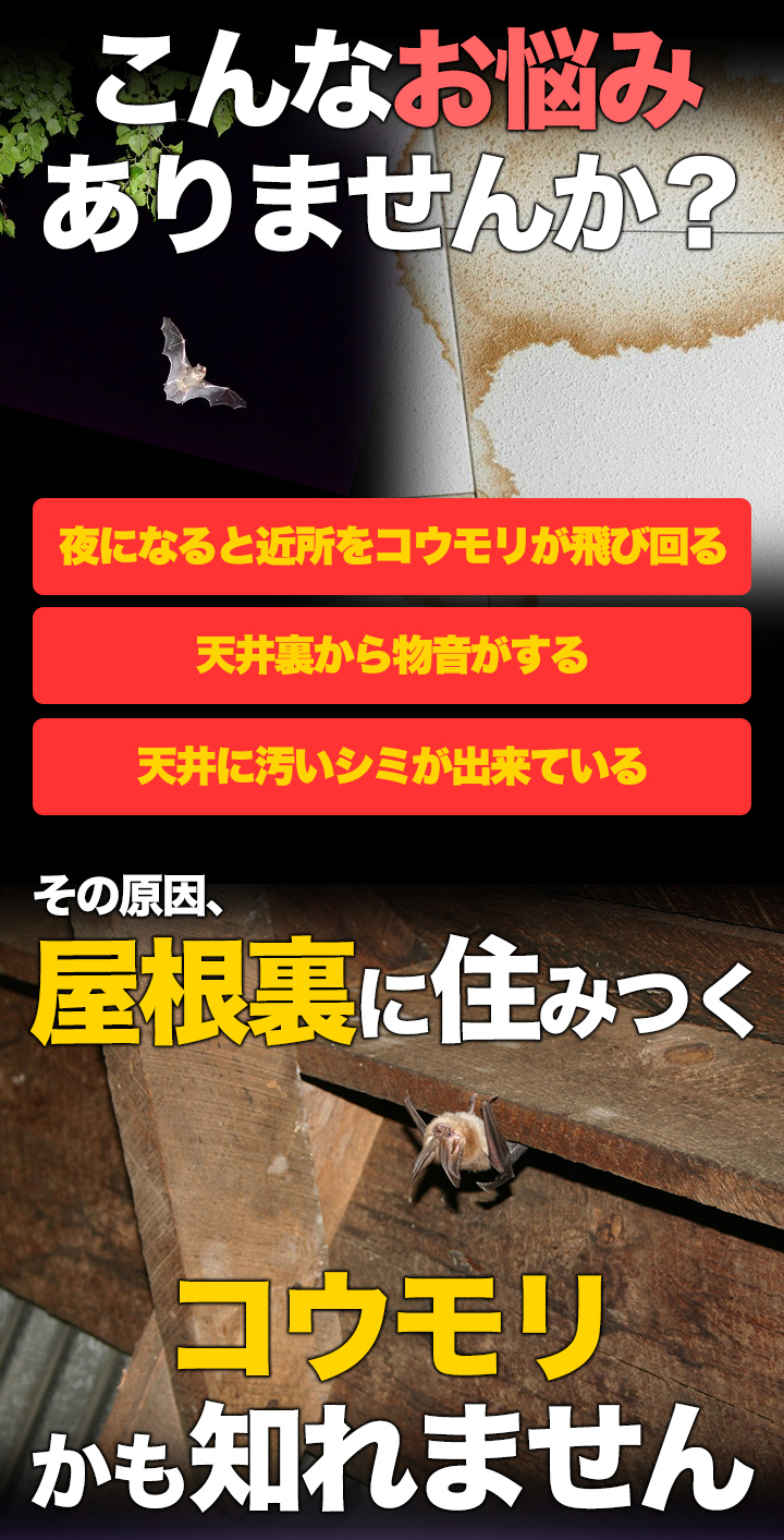 - 天井裏(屋根裏)、戸袋、シャッターボックス等に住みつくコウモリの追い出し、侵入防止