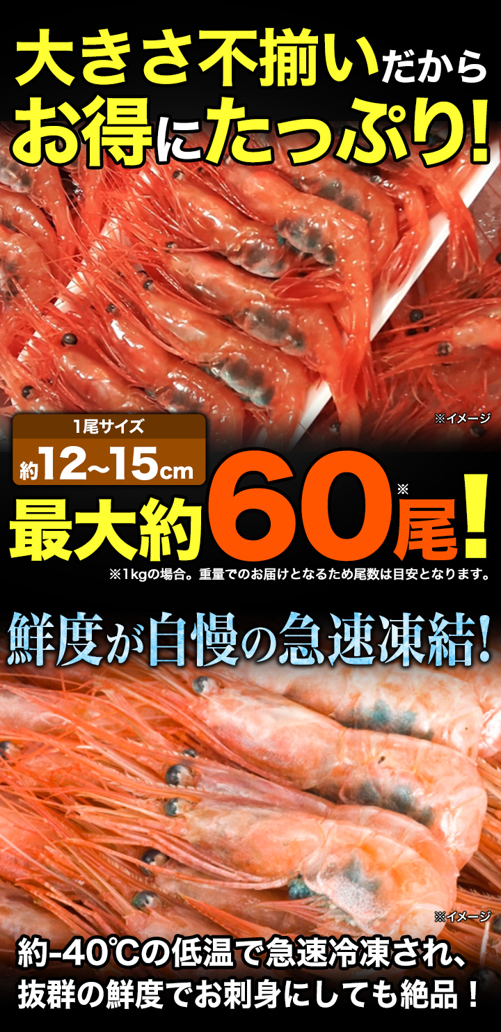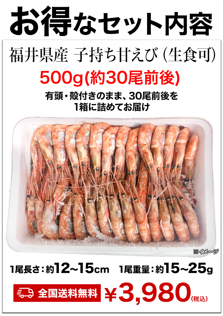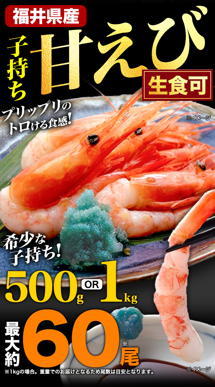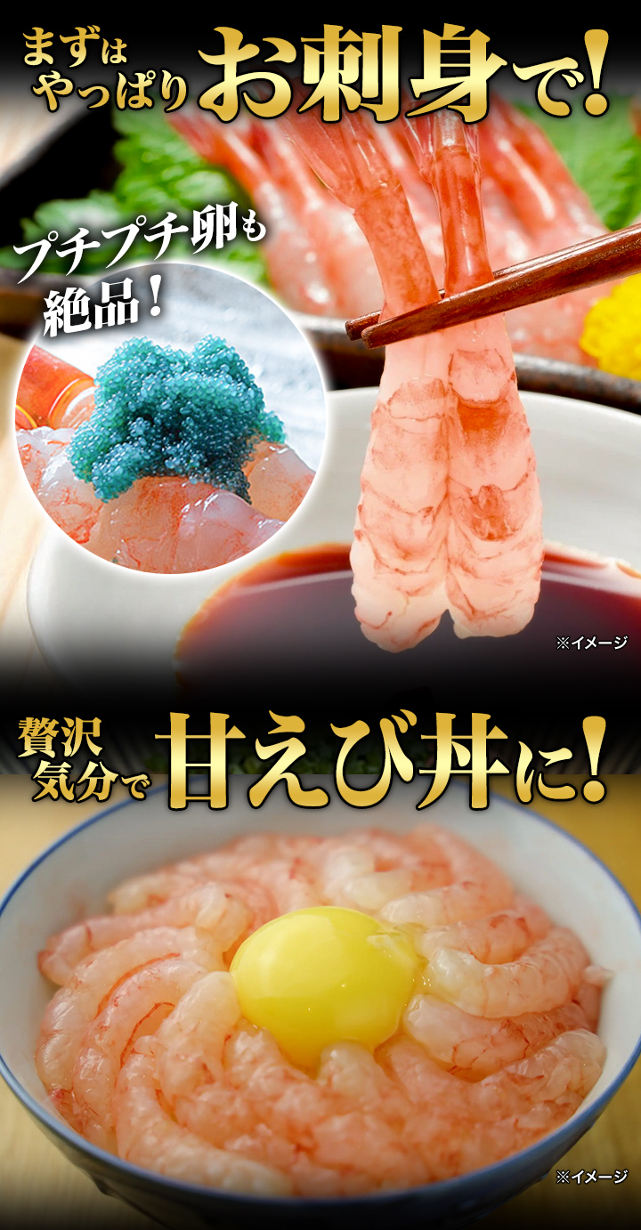 鮮度抜群!子持ちのみを厳選したお刺身可能なプリプリ甘えびを特大ボリュームでお届け!