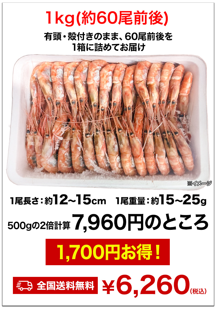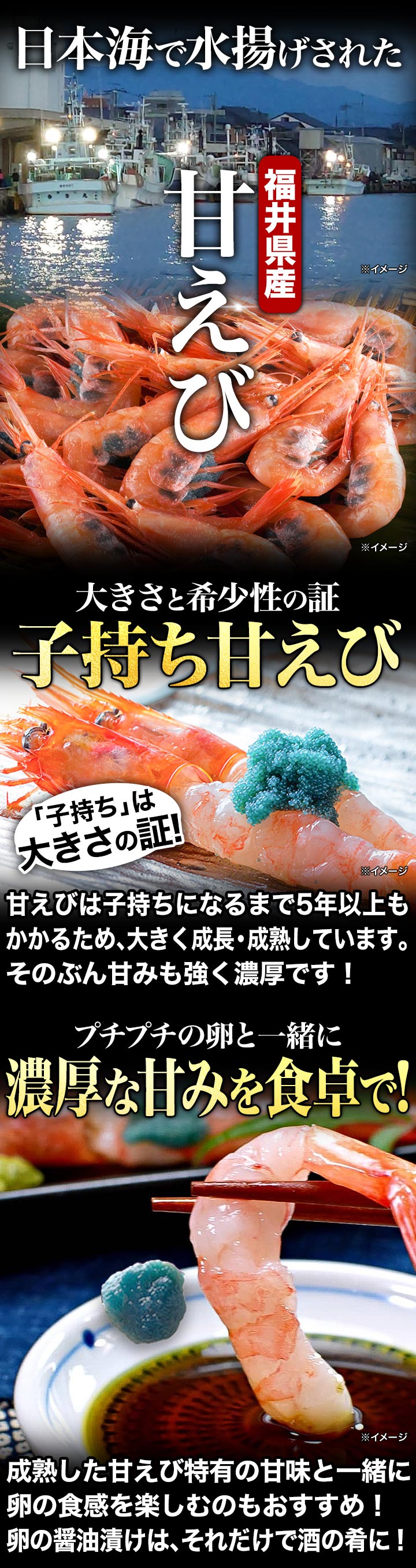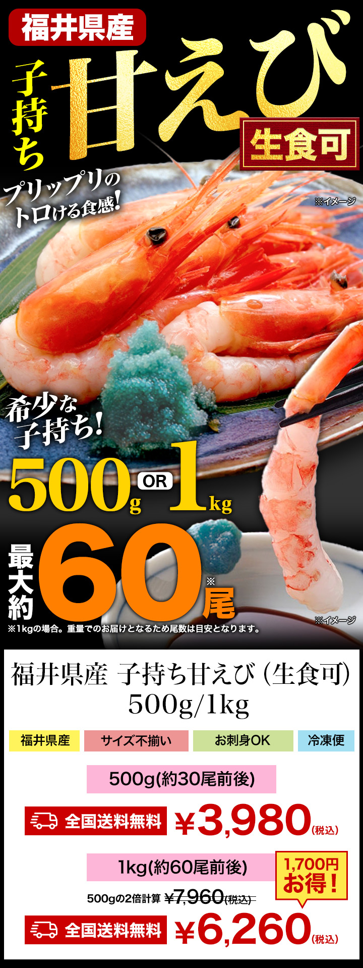 鮮度抜群!子持ちのみを厳選したお刺身可能なプリプリ甘えびを特大ボリュームでお届け!
